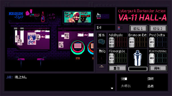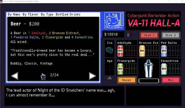 调配框位于屏幕右侧,其中包含五种调酒材料(分别是adaelhyde、bronson ext、pwd delta、flanergide和karmotrine)、两种添加物(冰块与age)、两个槽位(1槽和2槽),以及“重置”和“混合”两个操作键。需要特别留意“混合”键:刚开始混合时属于轻度摇晃状态,5秒钟后会切换为快速摇晃;部分饮品仅适用于轻度摇晃,因此不能进行快速摇晃操作。
