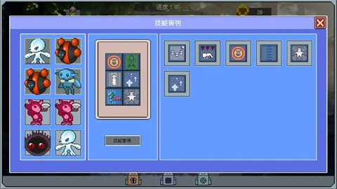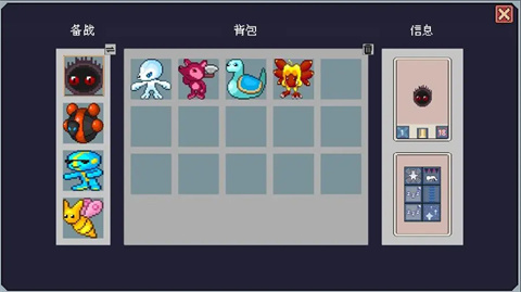 1、左侧展示当前使用的精灵阵容,中间是存放精灵的背包(背包设有容量上限),右侧为精灵信息展示栏,点击技能图标即可查看对应技能的详细介绍。
