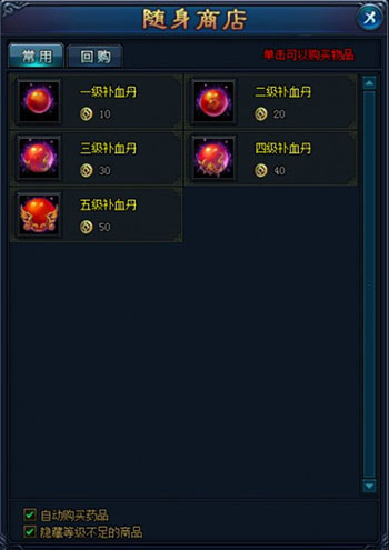 点击背包界面里的【商店】按钮,就能进入如上图呈现的个人随身商店,玩家可以在这个商店中购买常用道具。