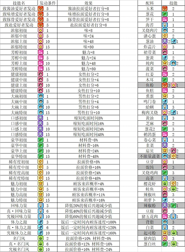 ③配料对应技能和效果 。灰色背景为不可购买的配料,致XX爱好者发动是什么面就发动什么爱好者。