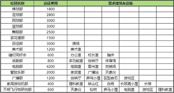 2. 除了上述设施外,部分社团还需满足特定条件才能解锁。