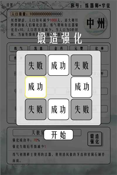 《炼器的日子》是一款文字修仙生存游戏,玩家将化身擅长炼制仙器的师傅,核心目标是提升仙器的武力值与等级。在这个妖怪横行、人口锐减的世界里,你亲手锻造的精良武器,是守护人们免遭毁灭的关键。通过选择不同修炼路径参与降妖战斗,不断实现自我成长与境界突破,方能从容应对挑战、阻挡妖魔侵袭的脚步。
