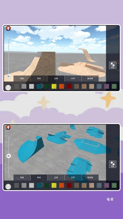 1.支持全自定义场地编辑,玩家可自由搭建坡道、栏杆、跳台等模块,构建专属挑战场景。
