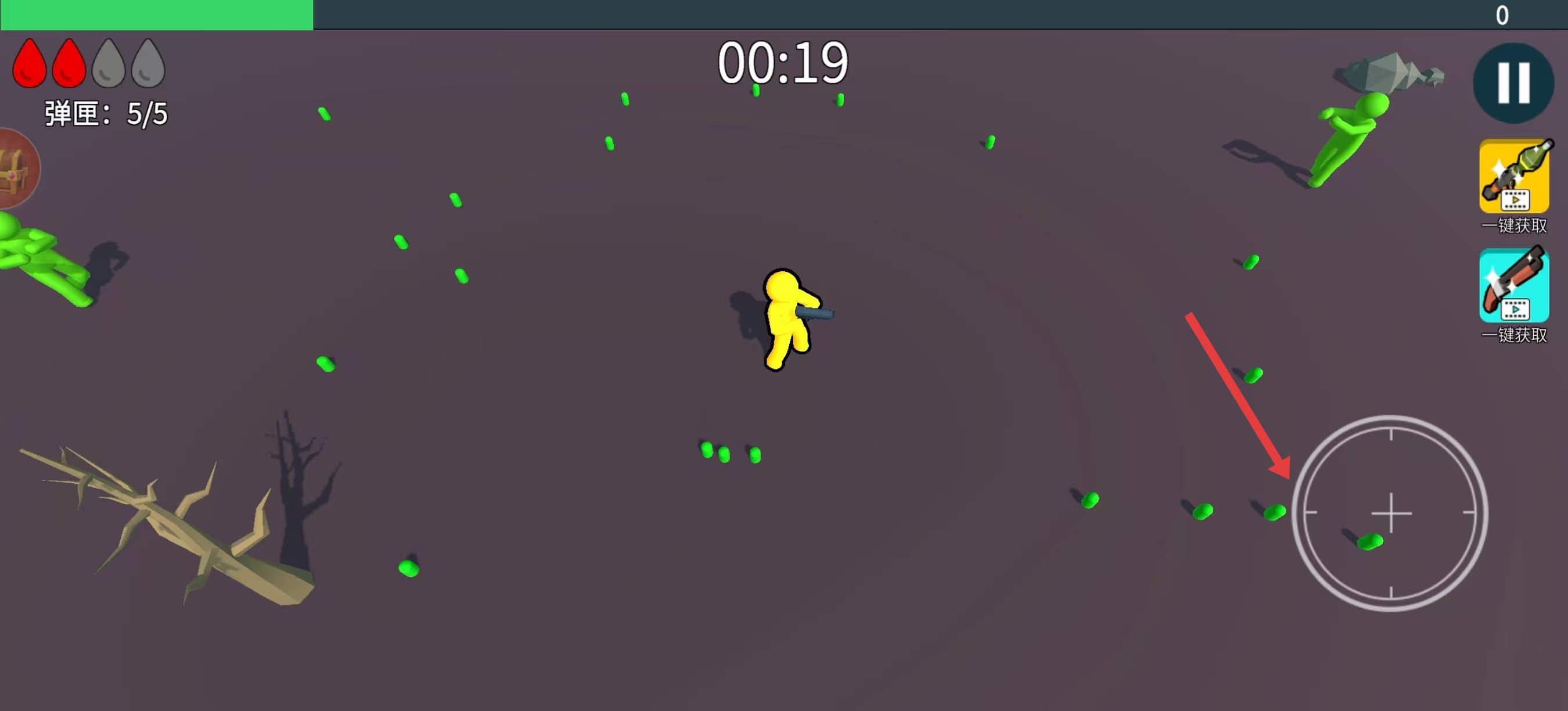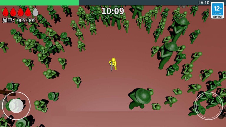 3、进入关卡1的战斗场景后,操控角色进行移动,使用武器射击绿色敌人,同时注意躲避敌人的攻击,收集场景里的绿色道具,坚持到时间结束或者消灭掉所有敌人即可。