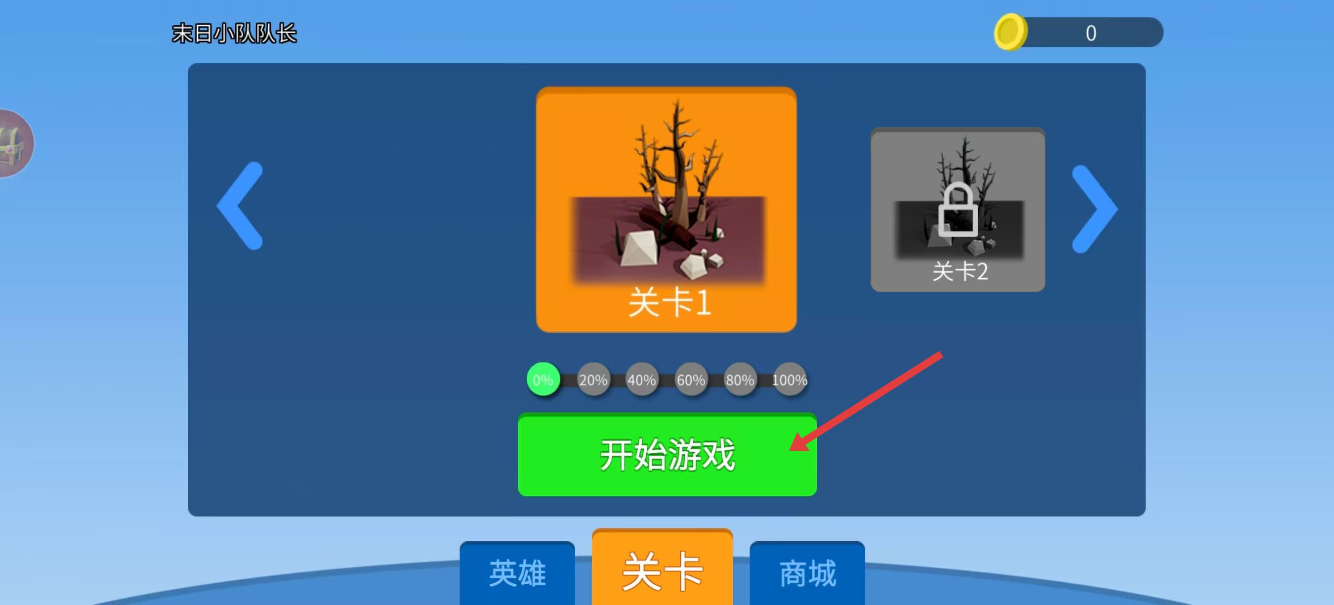 2、玩家在主界面选择关卡1,点击开始游戏按钮,即可进入末日生存战斗场景,开启第一关挑战。