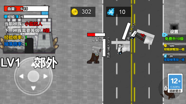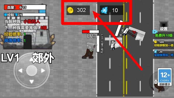 2.左上角红色条为角色血量,白色条为经验值,保持血量同时积累经验升级可解锁更强种族与战斗能力。