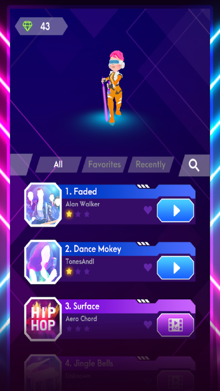 2、所有歌曲均可免费畅享,只要完成关卡挑战任务,就能自动解锁全球范围内最热门、最具动感的音乐单曲。