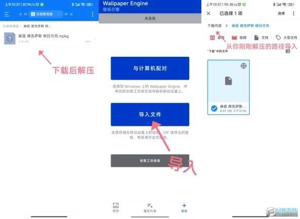 先安装壁纸引擎软件,接着找到对应的壁纸资源压缩包并解压,之后打开壁纸引擎,在软件内导入解压后压缩包里后缀为mpkg的文件。