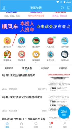 1、打开淮滨论坛,进入首页,点击“车找人”模块