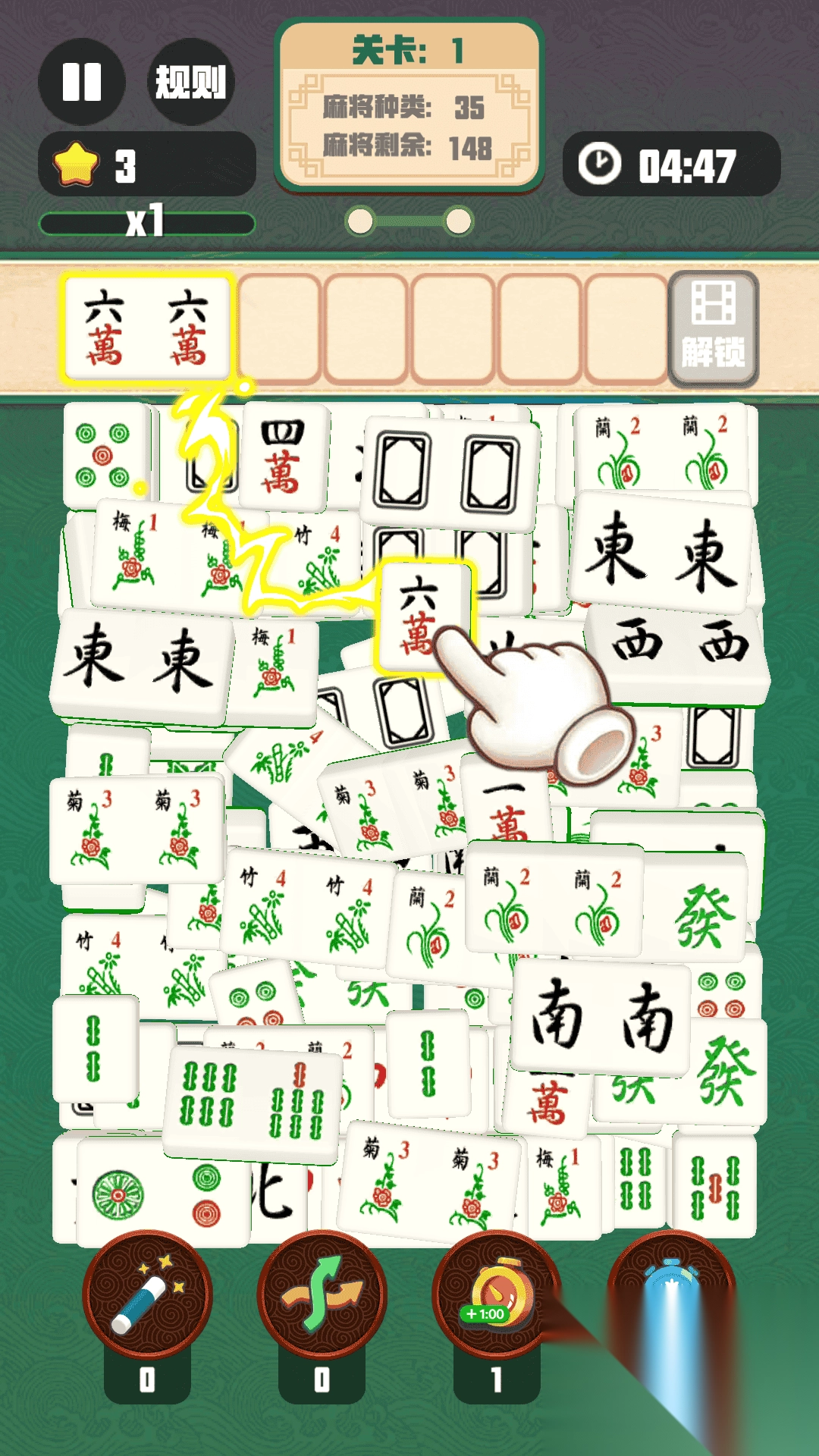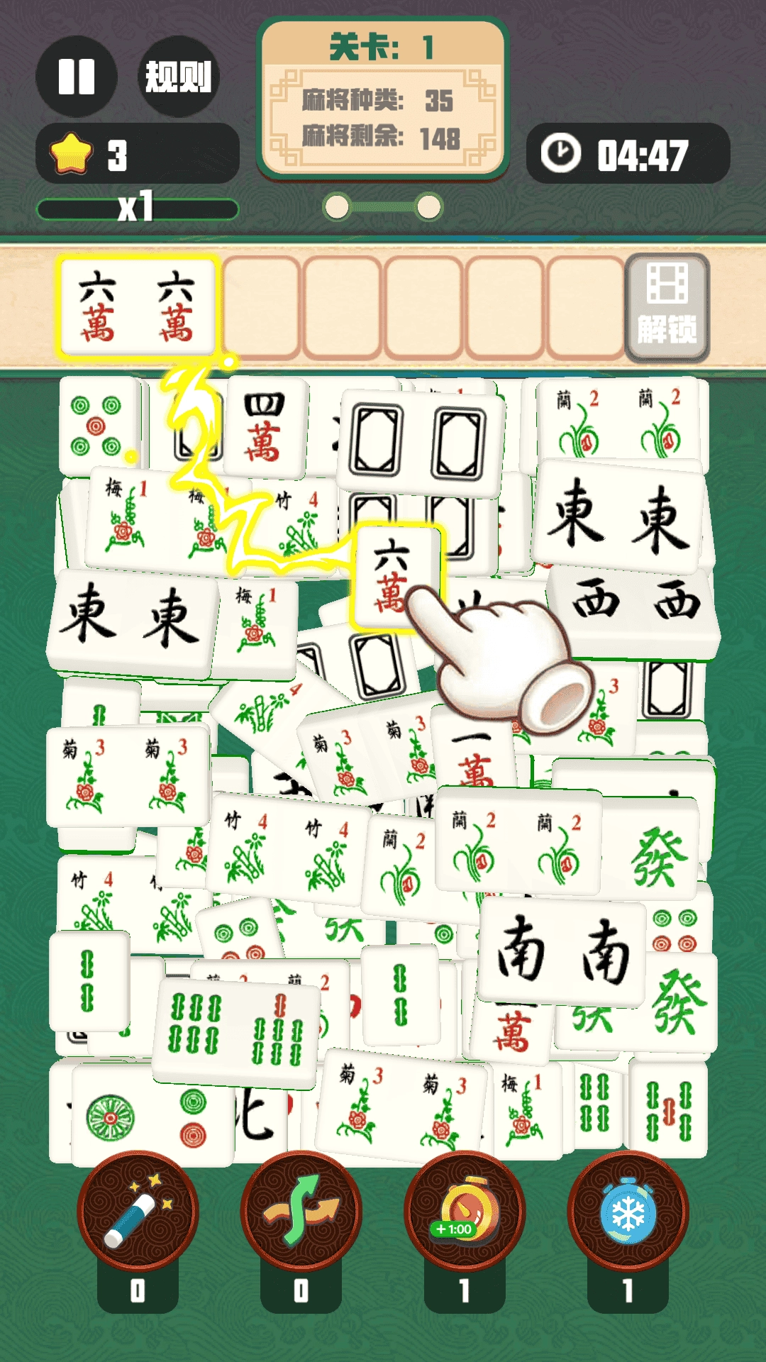 1. 通过点击选择两张相同的麻将牌进行消除,但要注意这两张牌之间必须有畅通的连接路径。