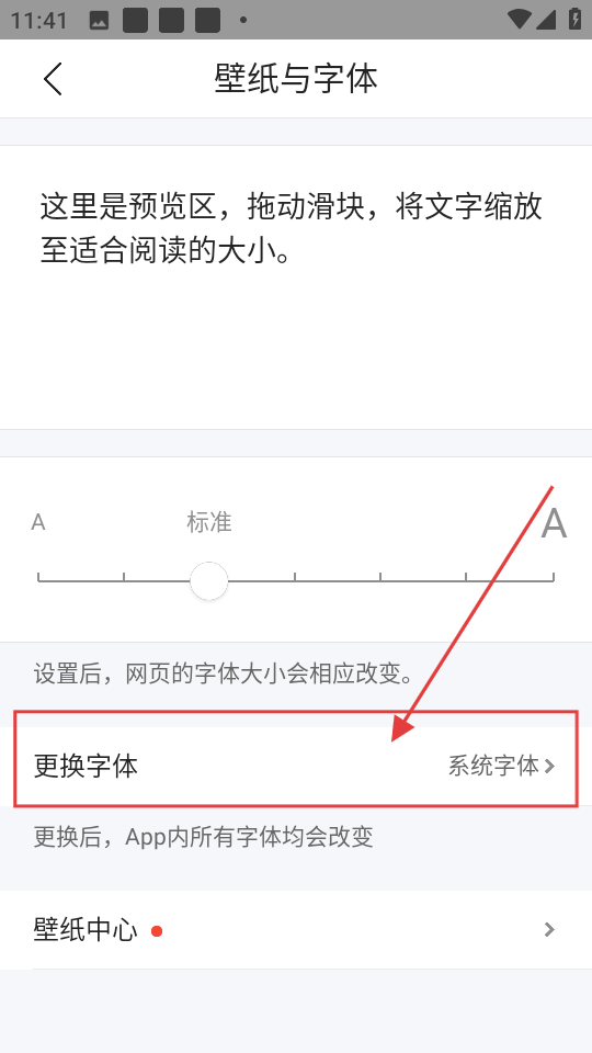3、来到【壁纸与字体】页面,能看到文字缩放滑块,接着点击【更换字体】选项,去挑选喜欢的字体哟。
