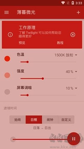 薄暮微光汉化版,一款专注于睡眠辅助的专业软件。它会依据时间的推移,智能变换屏幕显示画面。当太阳落下,它能自动去除手机、平板屏幕发出的蓝光,转而呈现令人舒适的红色光,悉心呵护你的双眼。如此,身体内负责调节作息的激素得以正常分泌,助你拥有更香甜的睡眠。要是你常常睡眠不稳,那就赶紧前往kk网站体验一番吧。