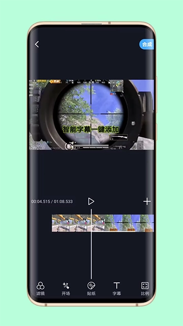 3、添加视频进行剪辑,点击下方剪辑功能栏可以给视频添加滤镜、开场、字幕和贴纸,设置好之后点击右上角合成;