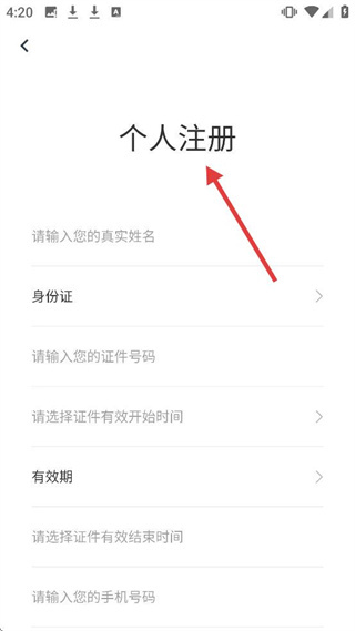 4、在个人注册页面,填写真实姓名、身份证号、证件有效时间、手机号码等信息,完成注册。