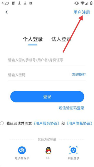 3、在登录界面点击右上角【用户注册】,进入个人注册页面。