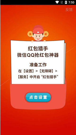 1、大家安装好红包猎手最新版本之后,可以打开可以看到一个开启提示,点击“点击设置”;