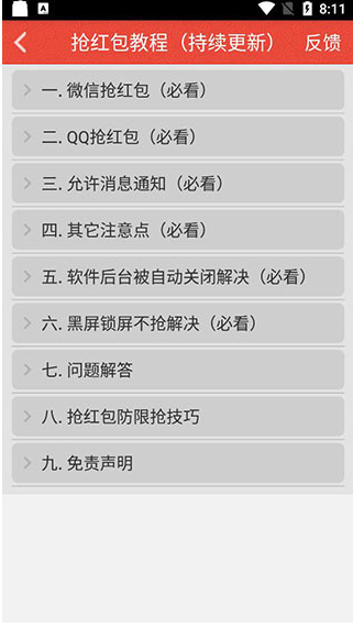 2、请关闭其它红包辅助服务,包括手机自带的红包助手,防止抢红包被干扰。
