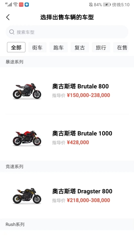4、选择出售车辆的车型,包括街车、跑车、复古、旅行、在售等分类,也可以进行搜索;