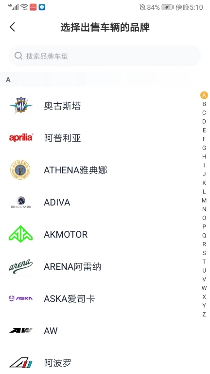 3、滑动屏幕可以浏览并选择出售车辆的品牌,也可以在上方搜索框搜索相应的品牌;