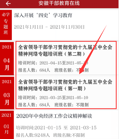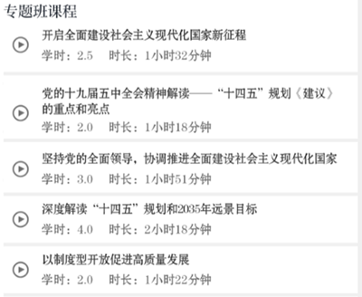 点击专题班,选择“全省领导干部学习贯彻党的十九届五中全会精神网络专题培训班(第一期)”或“全省领导干部学习贯彻党的十九届五中全会精神网络专题培训班(第二期)”,即可进入该专题班。