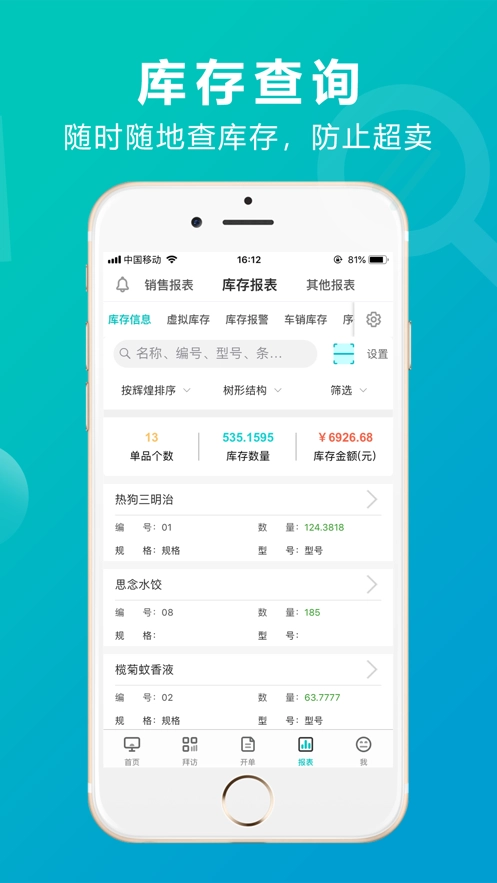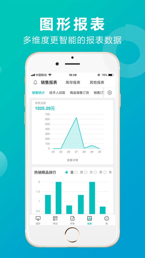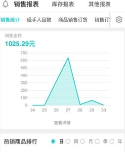 4、财务报表管理:进货/销售/盘点/调拨报表、业务员日报表、经营报表。