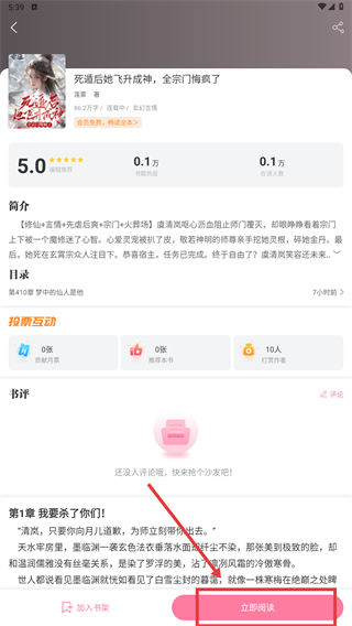 3、在详情页点击【加入书架】,可收藏作品;点击【立即阅读】,进入小说阅读界面。