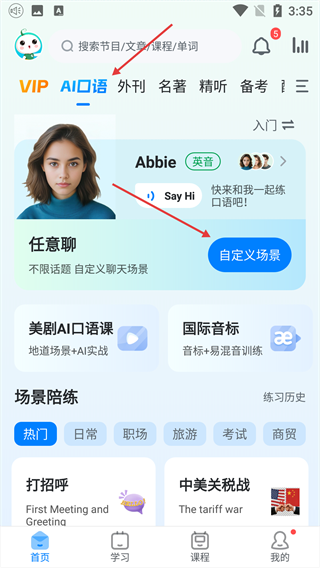 1、进入“AI口语”板块,找到“自定义场景”按钮并点击。