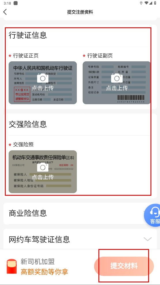 4、上传【行驶证正页】-【交强险照】等相关材料,仔细核对确认无误后提交,即可完成雷利出行司机端的资料提交流程。