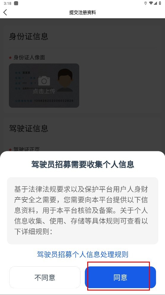 2、在个人信息收集提示框中点击【同意】按钮,就能继续提交注册所需的资料,从而推进雷利出行司机端的注册流程。