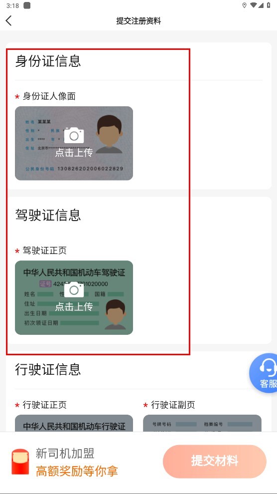 3、进入提交资料的页面后,上传【身份证人像面】、【驾驶证正页】等相关信息,以此完善雷利出行司机端的注册资料。