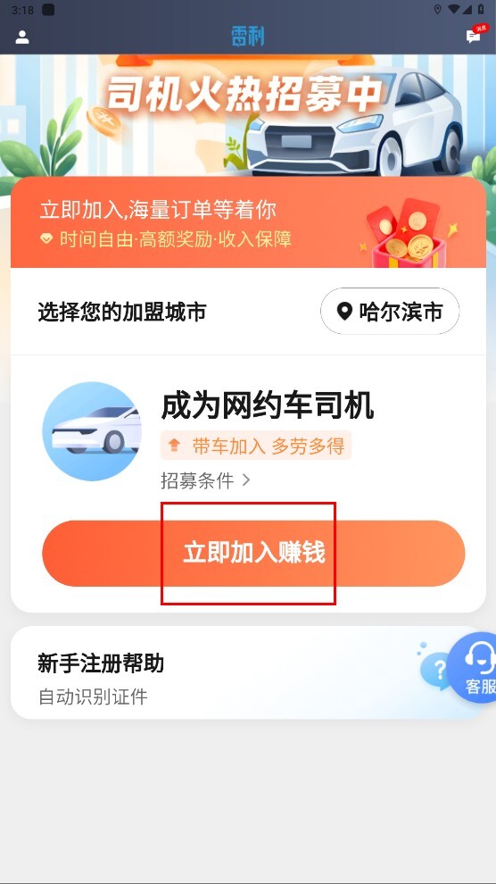 1、选择【哈尔滨市】这类城市后点击【立即加入赚钱】,就能进入雷利出行司机端的注册流程,迈出成为网约车司机的第一步。