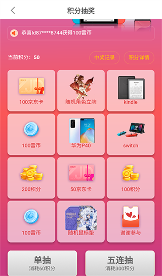 3、接着使用获取到的积分,在【积分抽奖】页面参与抽奖赢取大奖。