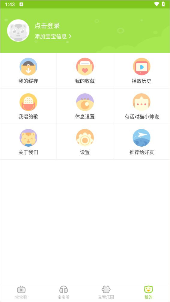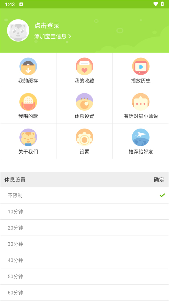 1、先打开猫小帅儿歌,进入“我的”页面后,点击“休息设置”选项。