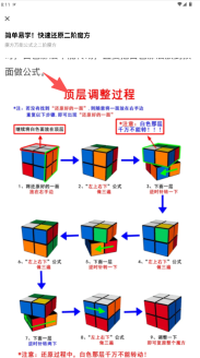 3、按照“顶层调整过程”的图示步骤反复练习、注意保持白色面朝上且底层始终不能转动。