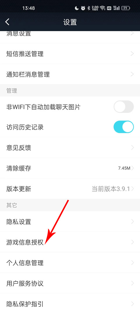 4、进入系统设置界面后向下滑动屏幕,在“其他”分类里找到“游戏信息授权”这一选项。