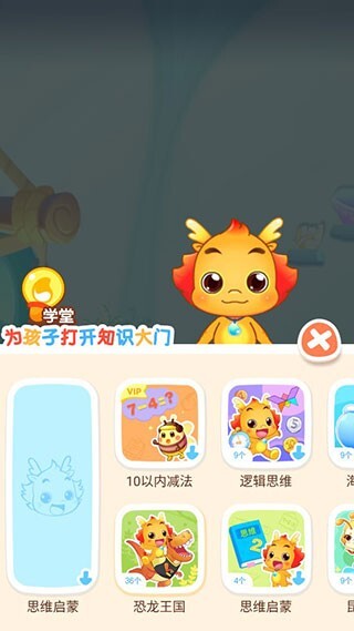 小伴龙是深圳市有伴科技有限公司开发的儿童早教启蒙软件,内含丰富教学内容,通过可爱的卡通画面设计吸引孩子注意力,依据科学教学理念为不同年龄段儿童提供启蒙指导,丰富的高品质内容能让孩子收获满满,有需要的朋友可以在本站使用。