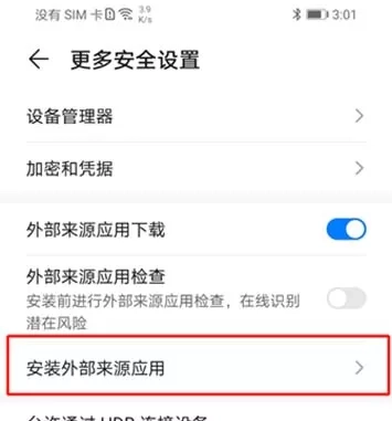 2、开启“外部来源应用”,关闭“外部来源应用检查”