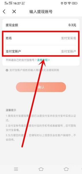 8、最后,我们在输入提现账号的页面正下方找到确认按钮,点击它就能成功提现活动红包了。