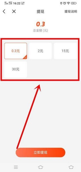 5、进入提现页面后,在该页面找到并选定提现金额,点击选中即可。
