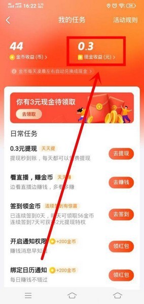 3、进入“我的任务”页面后,在页面右上方找到“现金收益”选项,点击进入。