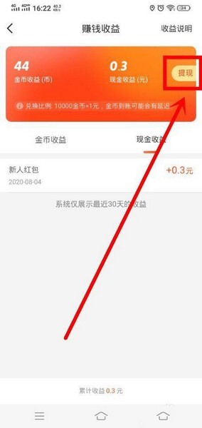 4、进入赚钱收益页面后,在页面右上方找到提现按钮,点击进入。