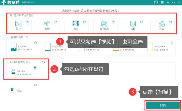 2.在软件中勾选上【视频】,然后在可移动驱动器上勾选上内存卡所在的盘符,