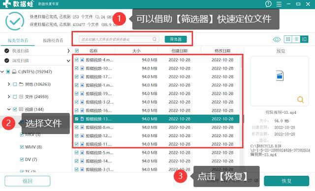 【深度扫描】;4.深度扫描会对内存卡内的视频开展较为全面的扫描,待扫描结果呈现后,既能够直接进行选择,也可以通过【筛选器】来提升选择效率;