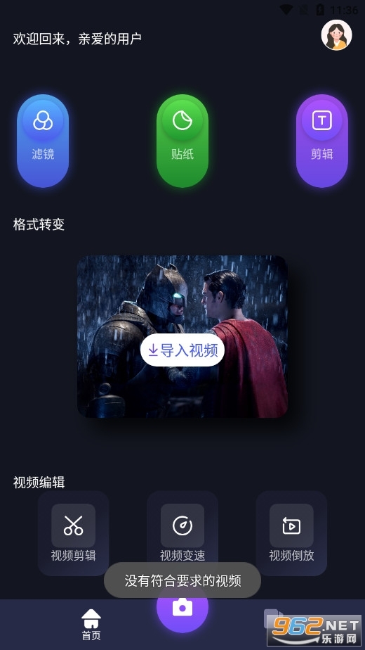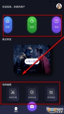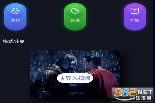 的上方栏目设有滤镜、贴纸和剪辑功能;中间区域用于格式转换;视频编辑部分则涵盖了视频剪辑、变速、倒放等常用功能。