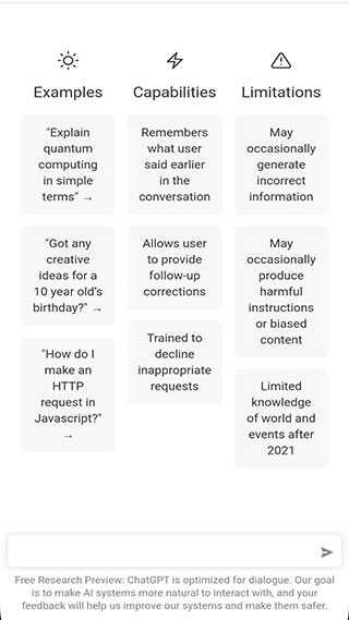 登录后会进入ChatGPT的主界面,屏幕正下方就是用于使用ChatGPT的输入对话框。ChatGPT采用交互式对话界面,使用起来十分便捷友好,你可以随意输入感兴趣的内容并按下回车,ChatGPT就会为你做出回答。