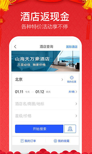 国内覆盖600多个主要城市,可查询并预订20000多家酒店;上千家高星级酒店支持预付直减,单晚最高能省955元;预订酒店还能享受返现优惠,每间夜最高返220元。