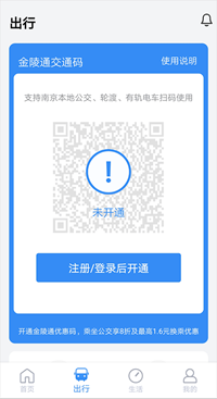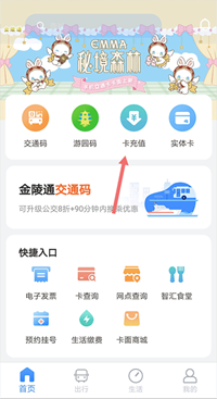 3、若没有实体卡,可在首页点击【金陵通交通码】申请电子公交卡,申请成功后就能在线完成充值操作。