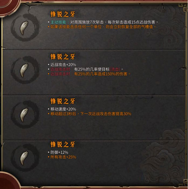 近战攻击时:有25%的几率使目标流血,有25%的几率造成150%的伤害锋锐之牙。