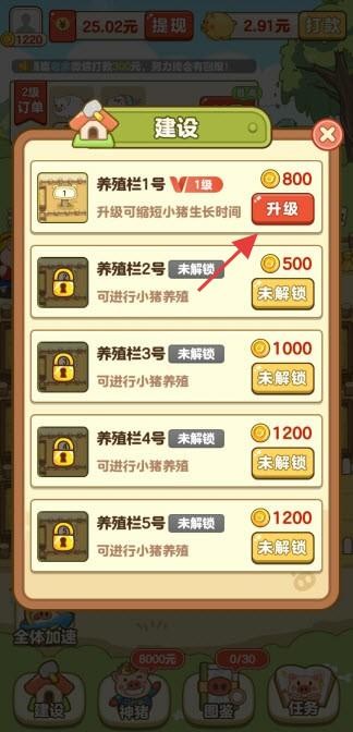 3、玩家可在游戏的【建设】界面,对养殖栏(例如养殖栏1号)进行升级,解锁新的栏位,从而提高养猪场的养猪效率。