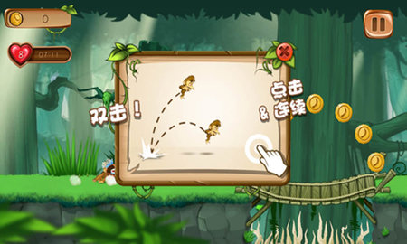 《森林岛大冒险》是一款极具挑战性的趣味游戏,玩家需用手指滑动屏幕操控猴子,灵活躲避沿途的各类障碍物;跳跃时要持续收集路上的金币,同时避开其他猴子的攻击,最终顺利抵达终点——你能否成功完成这场冒险呢?
